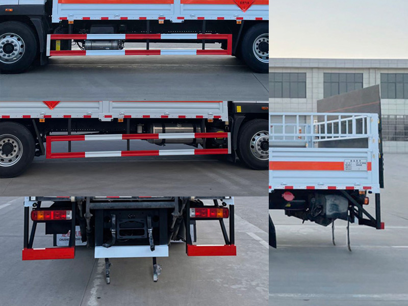 其它:1、該車適用于運(yùn)輸危險(xiǎn)品。運(yùn)輸具有獨(dú)立容器(瓶)包裝的物品,類項(xiàng)號(hào):2.1,2.2。2、側(cè),后防護(hù)材料均為Q235,側(cè)防護(hù)螺栓連接;后防護(hù)焊接,截面尺寸120×50mm,下邊緣離地高490mm。選裝后部無(wú)尾板時(shí),后防護(hù)材料為Q235,焊接,截面尺寸120×50mm,下邊緣離地高490mm。選裝欄板樣式。3、僅采用軸距(mm):4700,5150。隨底盤(pán)選裝駕駛室,選裝電瓶、尿素罐、儲(chǔ)氣筒、后處理位置。僅選用排氣管前置、限速裝置(限速80km/h)、前輪盤(pán)式制動(dòng)及子午線輪胎的底盤(pán);安裝帶有衛(wèi)星定位功能的行駛記錄儀。該車轉(zhuǎn)向輪安裝輪胎爆胎應(yīng)急防護(hù)裝置,后軸采用空氣懸架。選裝ETC。EBS系統(tǒng)型號(hào)/生產(chǎn)廠家:EBS 5/克諾爾制動(dòng)系統(tǒng)(大連)有限公司,CM-EBS/廣州瑞立科密汽車電子股份有限公司。采用的發(fā)動(dòng)機(jī)與油耗值(L/100Km)對(duì)應(yīng)關(guān)系為:F4.5NS6B220/24.4,B6.2NS6B210/26。尾板收起狀態(tài)水平長(zhǎng)度為290mm,尾板質(zhì)量550kg。