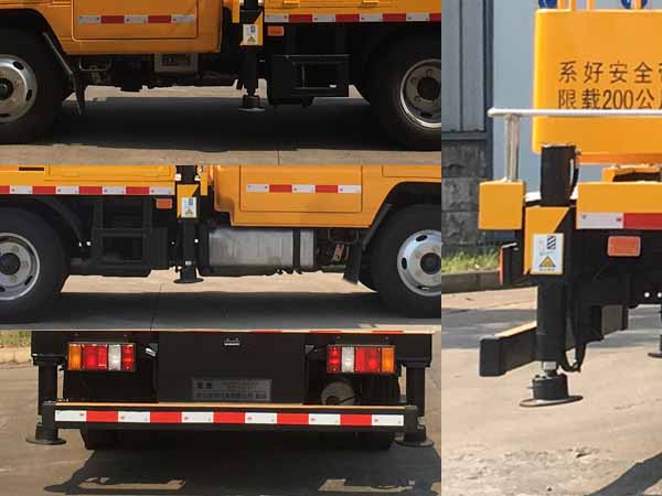配置  ABS型號:APG3550500A;ABS生產企業(yè):浙江亞太機電股份有限公司;選裝描述:門框黑色貼膜可選擇取消。選裝前臉、前部燈具、外后視鏡;側后防護情況:側、后防護材料均為Q235,側防護螺栓連接;后防護焊接,截面尺寸120×60mm,下邊緣離地高380mm;專用功能及裝置:該車專用裝置為作業(yè)臂,主要用于搶修電力、通訊、路燈等高空作業(yè);前伸尺寸:220mm;后伸尺寸:100mm;