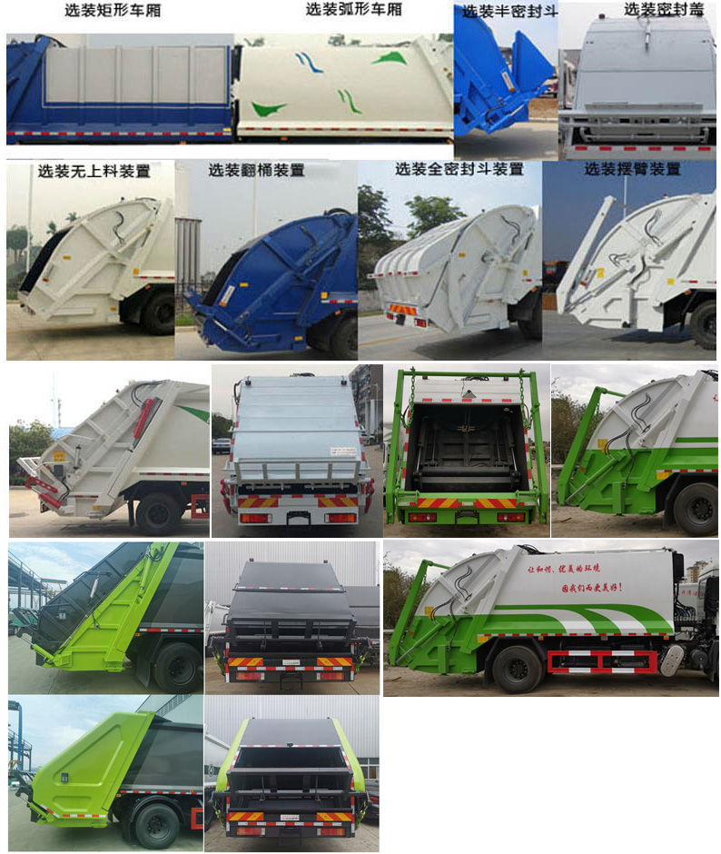 其它 | 1、該車(chē)主要專(zhuān)用裝置由箱體、壓縮系統(tǒng)組成,用于垃圾的收集與清運(yùn)。該車(chē)可選裝方形或弧形箱體,選裝全密封蓋裝置,選裝方形擋泥板,選裝側(cè)防護(hù)連接結(jié)構(gòu)件,選裝側(cè)防護(hù)樣式。選裝后部工作裝置。選裝多路閥位置,液壓油箱位置。選裝爬梯樣式;選裝工作裝置時(shí)外形長(zhǎng)/前懸/軸距/后伸對(duì)應(yīng)關(guān)系為(mm):①無(wú)上料裝置:8680/1400/4500/-,8710/1430/4500/-,8880/1400/4700/-,8910/1430/4700/- ;②全密封斗裝置和擺臂裝置:8880/1400/4500/200,8910/1430/4500/200,9080/1400/4700/200,9110/1430/4700/200;③翻桶裝置和翻斗裝置:9080/1400/4500/400,9110/1430/4500/400,9280/1400/4700/400,9310/1430/4700/400。僅采用4500mm,4700mm軸距。2、側(cè)防護(hù)采用冷彎型鋼/Q235,螺栓連接;后防護(hù)由專(zhuān)用裝置替代,下邊緣離地高:500mm。3、隨底盤(pán)選裝選裝高度不同的駕駛室;選裝前霧燈;選裝駕駛室頂部裝飾燈;選裝駕駛室前面罩;選裝前保險(xiǎn)杠及前部燈具,選裝后視鏡;選裝后部燈具;選裝駕駛室前臉擾流罩;駕駛室臥鋪側(cè)窗選裝裝飾板,選裝后背式排氣管。安裝帶有衛(wèi)星定位功能的行駛記錄儀。ABS型號(hào)/生產(chǎn)廠(chǎng)家:3631010-C2000/東科克諾爾商用車(chē)制動(dòng)系統(tǒng)(十堰)有限公司,ABS 8/東科克諾爾商用車(chē)制動(dòng)系統(tǒng)(十堰)有限公司, 4460046450/威伯科汽車(chē)控制系統(tǒng)(中國(guó))有限公司,J ABS/焦作博瑞克控制技術(shù)有限公司。采用的發(fā)動(dòng)機(jī)與油耗值對(duì)應(yīng)關(guān)系為(L/100Km):DDi50E190-60/23.9,D4.5NS6B190/24.4,D6.7NS6B230/23.7,B6.2NS6B210/23.8,B6.2NS6B230/23.8。隨底盤(pán)選裝油箱位置。選裝箱體樣式,填裝器樣式。隨底盤(pán)選裝后處理、電瓶、尿素罐、備胎安裝位置。選裝油管布局. | ||